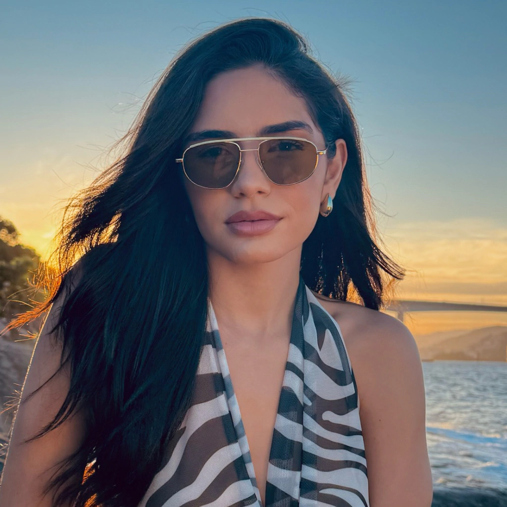 Este é o modelo perfeitooo para um rosto menor e mais fino, possui uma horizontal mais curta, uma proposta de "mini óculos" e lentes cosméticas que são a finalização perfeita para um óculos fashionista.